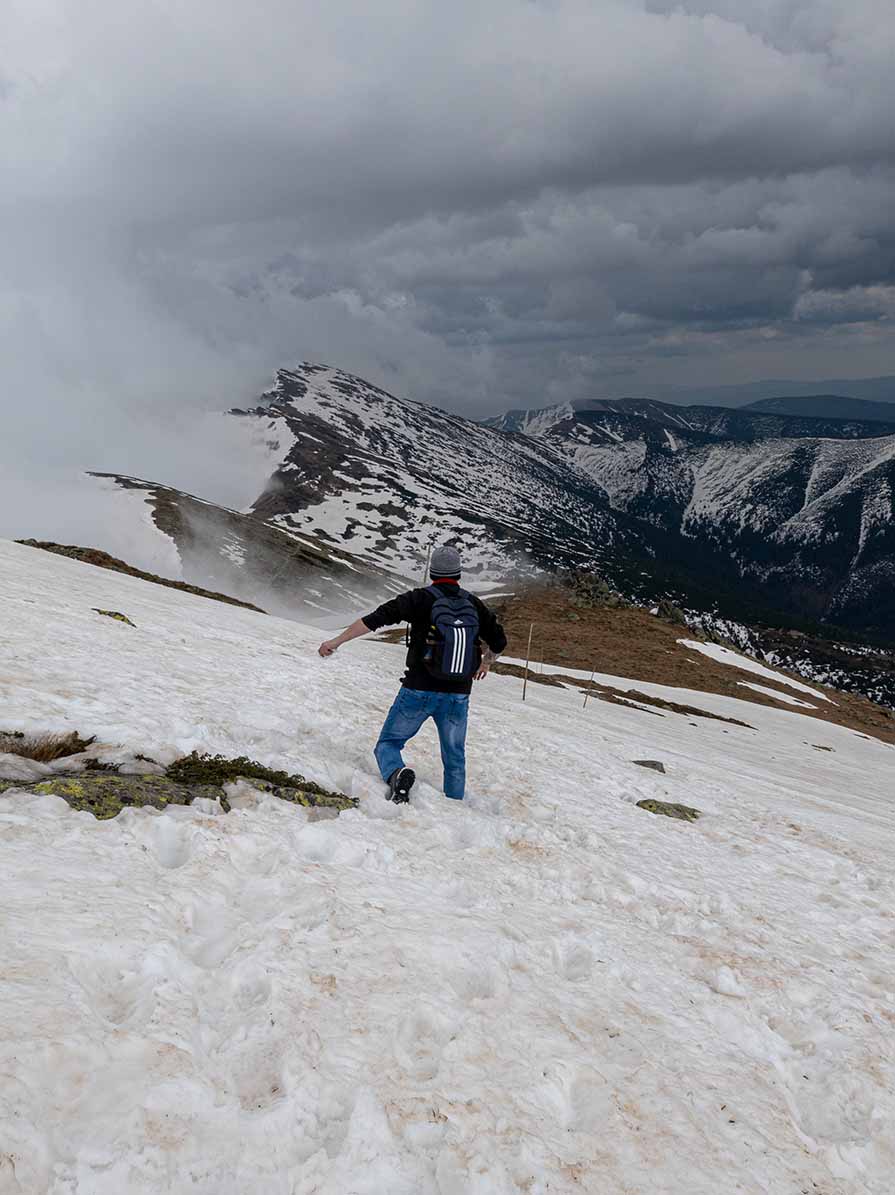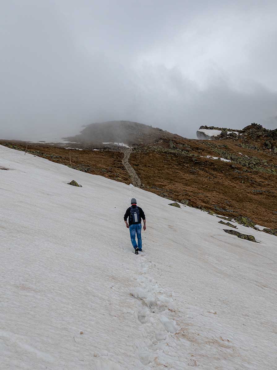 A folyamatos ereszkedés miatt a vízálló bakancs és a réteges technikai öltözet alapfeltétel a gerincen uralkodó jeges szélben 🥾❄️. Ködös vagy szeles időben különösen fontos a kihelyezett téli jelzőrudak szigorú követése, mert a friss hótakaró percek alatt teljesen elrejtheti a kitaposott ösvényt.