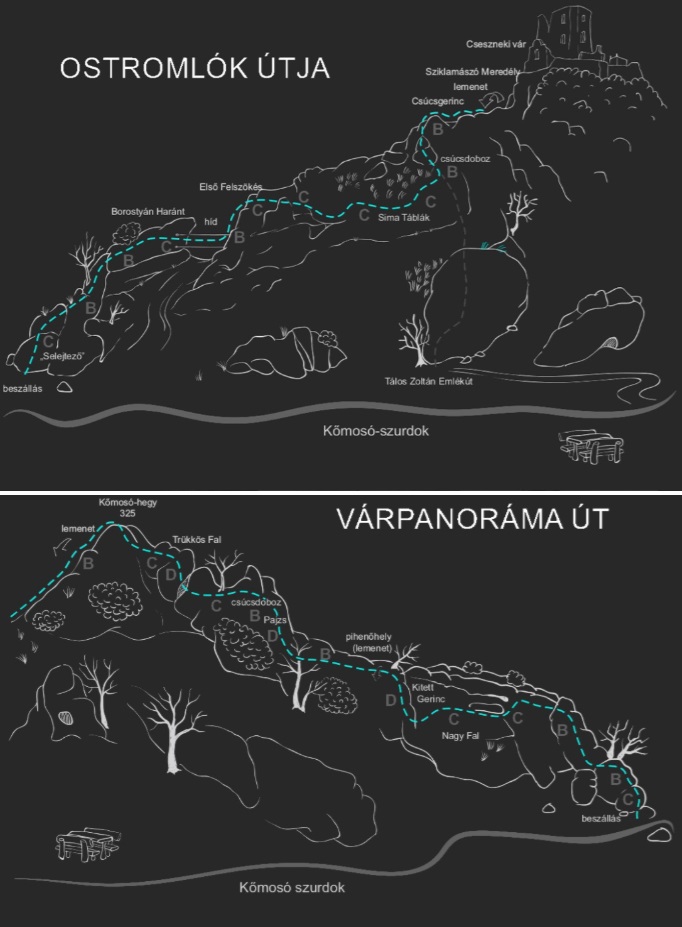 🥾 A cseszneki via ferrata a Bakonyban a várnál. Az Ostromlók útja (C) sportos, meredek résszel és traverzekkel, a Várpanoráma út (D) kitettebb, erősebb szakaszokkal és kilátással. Itt most csak ezt a két utat ismertetjük, a helyszínen további pályák is vannak 🇭🇺