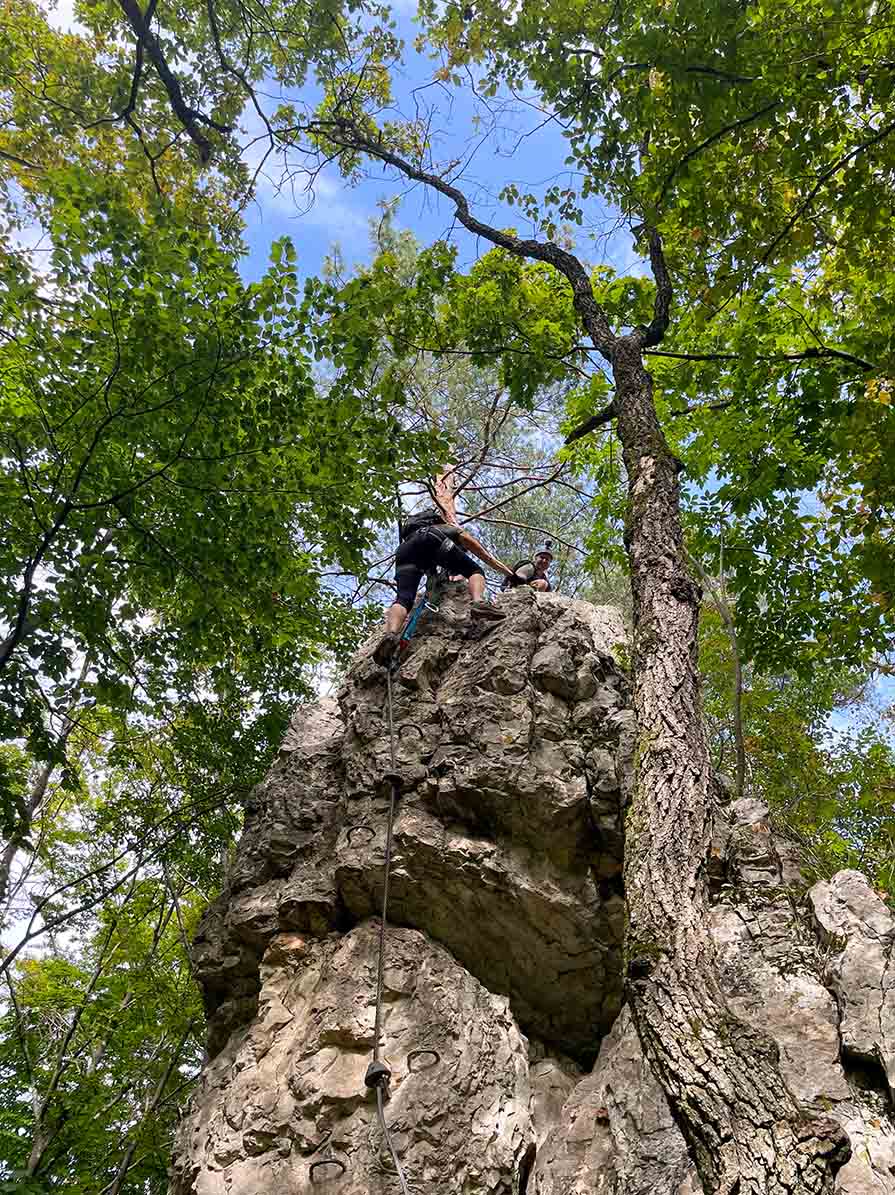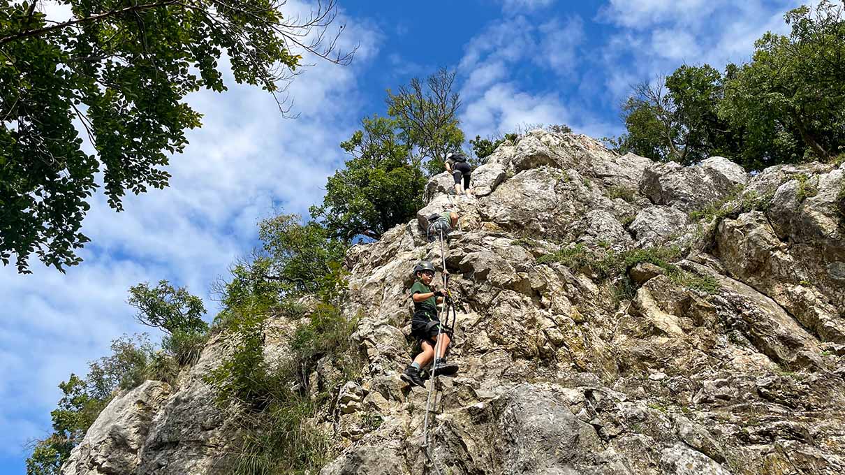 🌉 Szakaszok és jelleg: Mohos Csitri (B) – kiegyenlített nehézségű, lépéses falrészek és rövid traverzek, gyakorlásra ideális; Bucsek Henrik Emlékút (C) – gerinces vezetés két nepal (vietnámi) híddal (~7 m és ~23 m), a végén sportos, egyenes falrész zárással. 🧗♀️