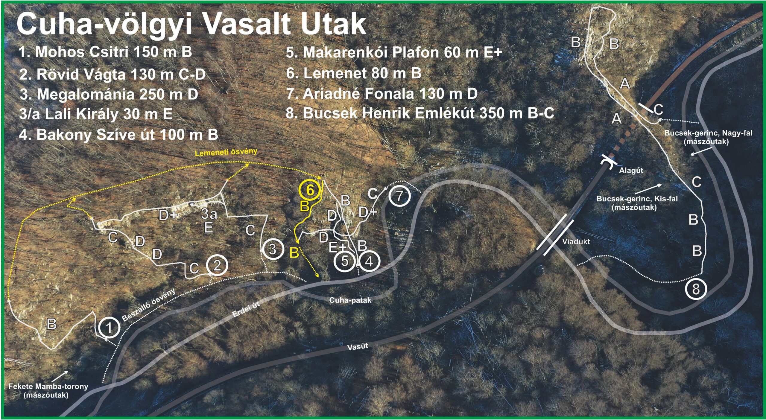 🥾 A Cuha-völgy via ferrata Vinyénél több útvonalat kínál; a Mohos Csitri (B) könnyebb, jól tagolt traverzekkel, a Bucsek Henrik Emlékút (C) sportosabb, rövid meredek szakaszokkal. Itt most csak ezt a két utat ismertetjük, a helyszínen további pályák is vannak. 🇭🇺
