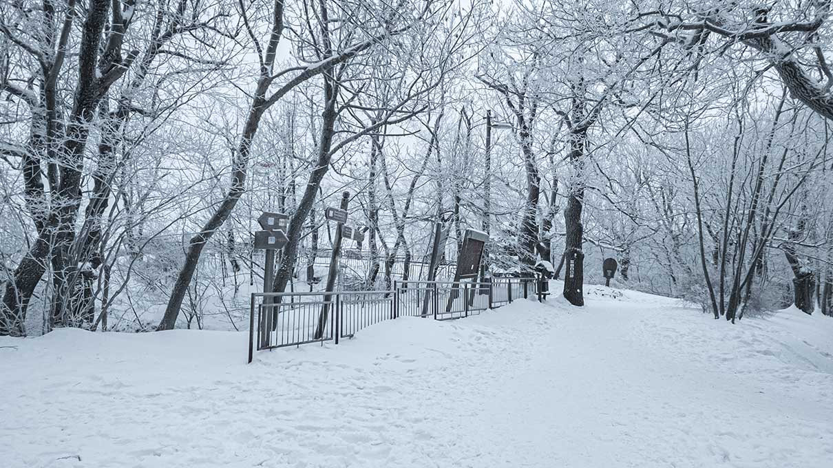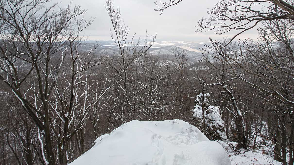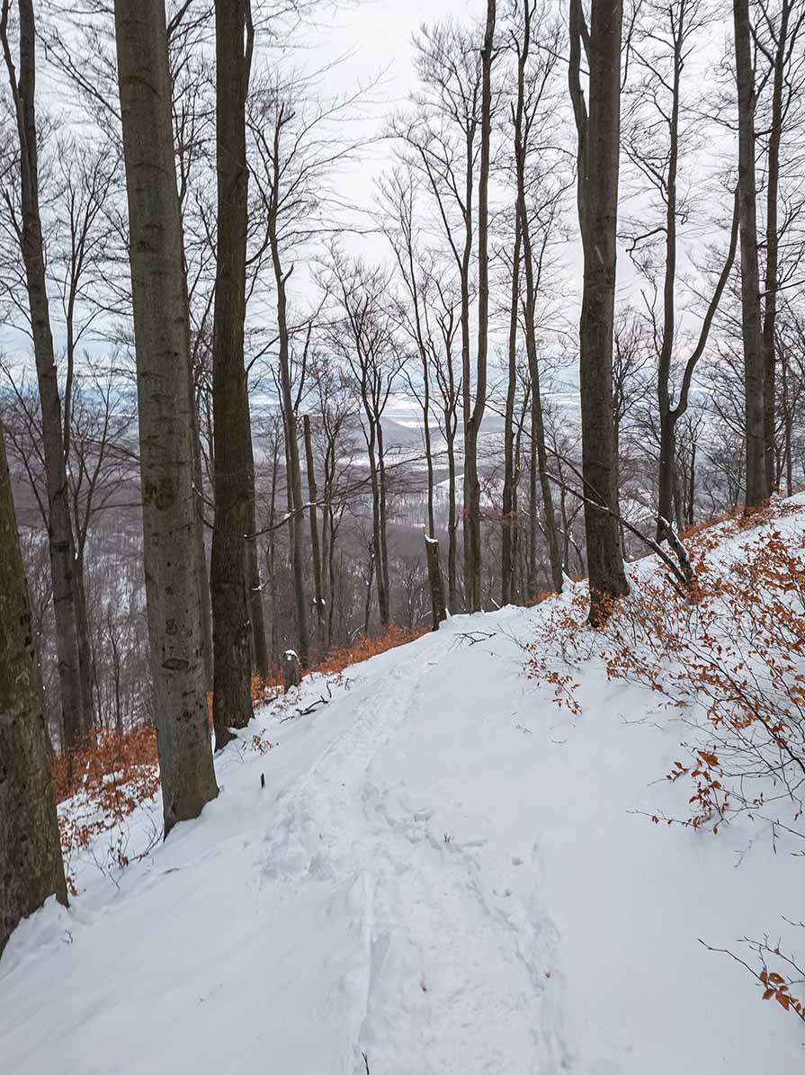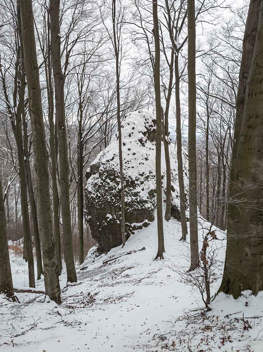 🪨 Az útvonal a kilátótól meredeken ereszkedve éri el a vadregényes kőtömböket: a Thirring-, Palócz-Peitler- és Eötvös-sziklák fehér köntösben különösen misztikus látványt nyújtanak. Itt nincsenek tágas rétek, az ösvény szorosan a sziklafalak tövében és fák gyökerei között kanyarog. A csúszós, lefagyott szakaszok és a sziklalépcsők miatt fokozott óvatosság szükséges, a korlátok hiánya miatt pedig a stabil lépés elengedhetetlen a havas rengetegben.