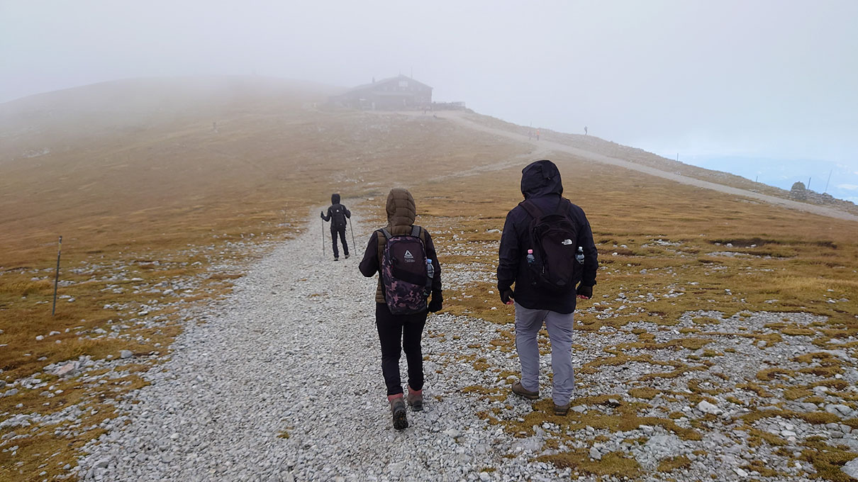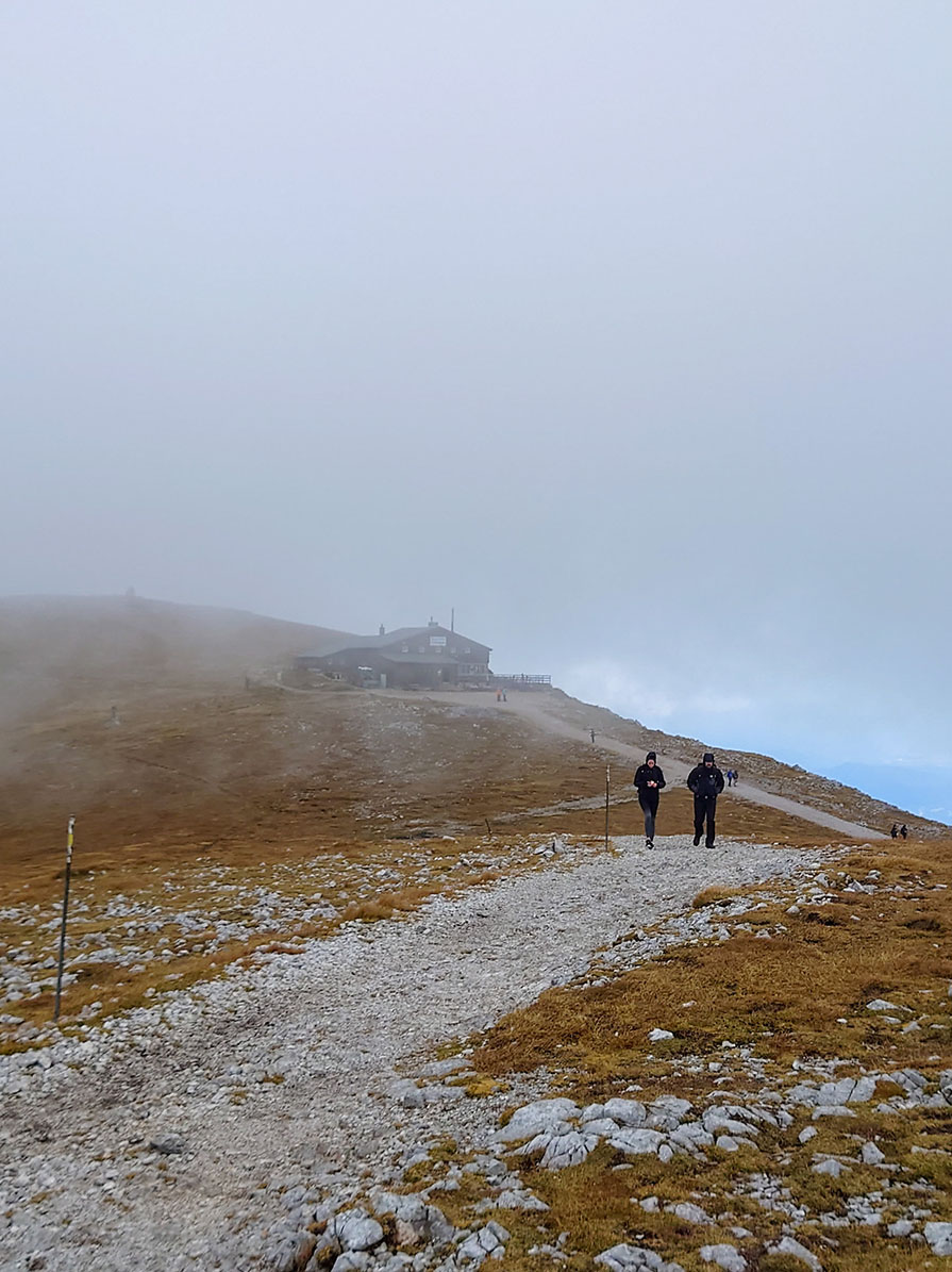 A csúcs közelében fekvő Fischerhütte klasszikus osztrák menedékház meleg ételekkel, a jelzett útvonal természetes pihenőpontja a fel- és levezető szakasz találkozásánál. 🇦🇹