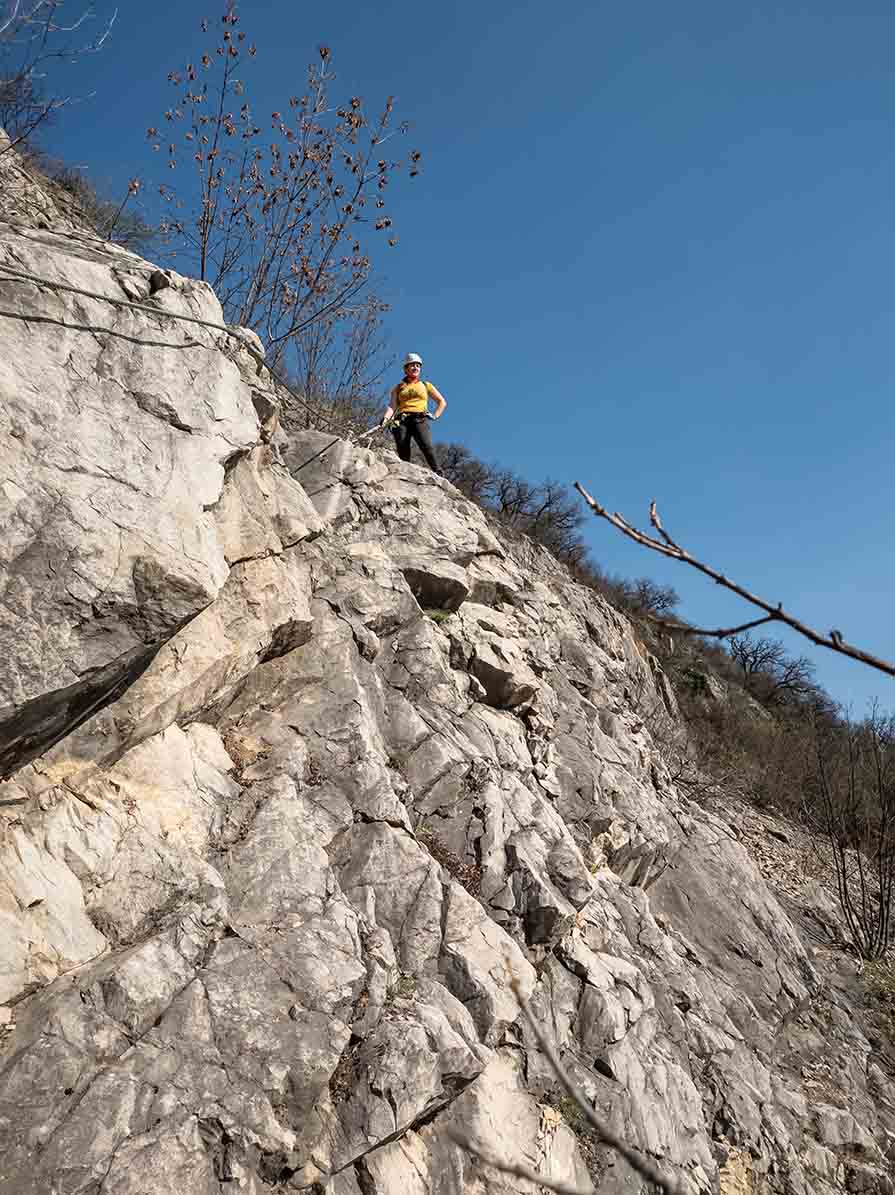 🌉 Szakaszok és mozgás: a pálya beépített lépésekkel, könnyű felszökésekkel és rövid oldalazásokkal tagolt. A beszállás után egy egyszerűbb falrész következik, ahol gyorsan magasságot nyerünk. Ezt jól követhető szakaszok váltják, amelyek stabil haladást biztosítanak a sziklán. A középső rész is könnyen mászható, itt rövid függőleges lépések jelennek meg, miközben a sziklafalról egyre szélesebb kilátás nyílik a Bakony dombvidéke felé. 🧗♀️