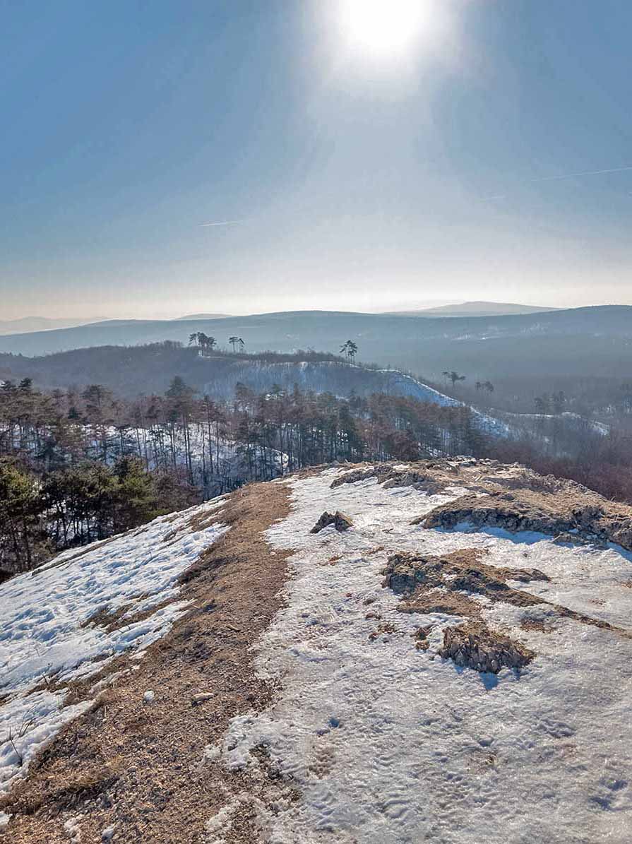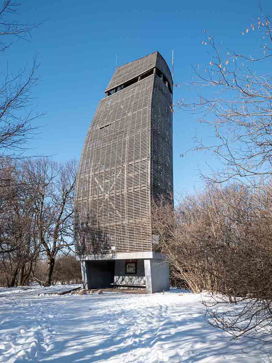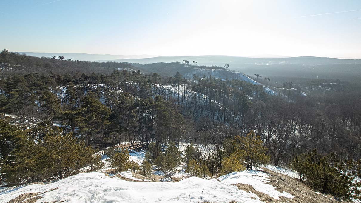 🏔️ Innen érjük el a a Tarnai-pihenőt, ami kilátásban és panorámában a túra legszebb pontja, majd folyamatos emelkedés után következik a vitorlát formázó Csergezán Pál-kilátó (Nagy-Kopasz) körpanorámája, ami a Budai-hegység legmagasabb pontja és az egész program legeszebb panorámáját ígéri. A feljutás a toronyba a rácsos lépcsőkön huzatos feladat, de a havas tetők látványa tiszta időben a Tátráig elér. A nyílt téren süvítő szél gyorsan áthűti az embert, így itt érdemes röviden időzni.
