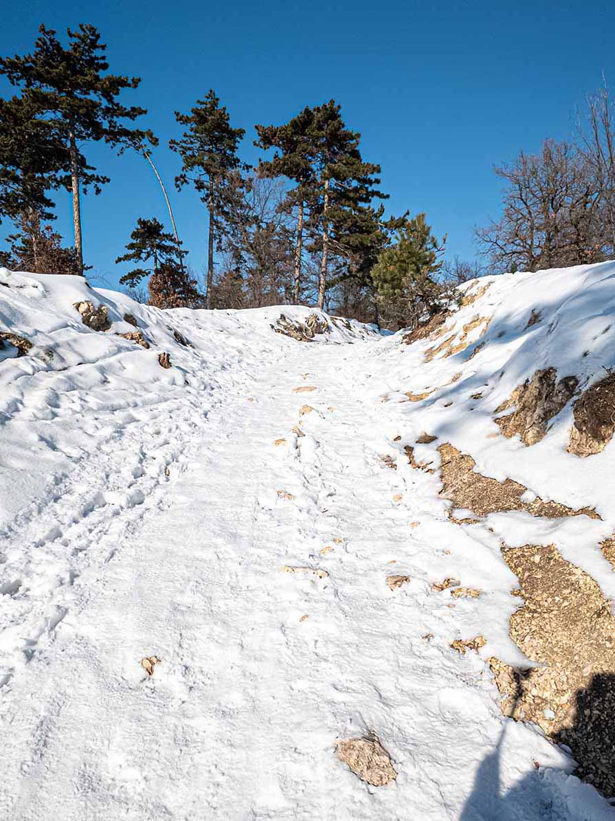 ⚠️ A csúcsról leérve azonban még nincs vége a gyaloglásnak: a visszaút a parkolóba egy hosszú, kifejezetten monoton ereszkedőn vezet. Ez a szakasz a túra végén, a mélyebb hóban járva alaposan kiveszi az erőt a térdekből.