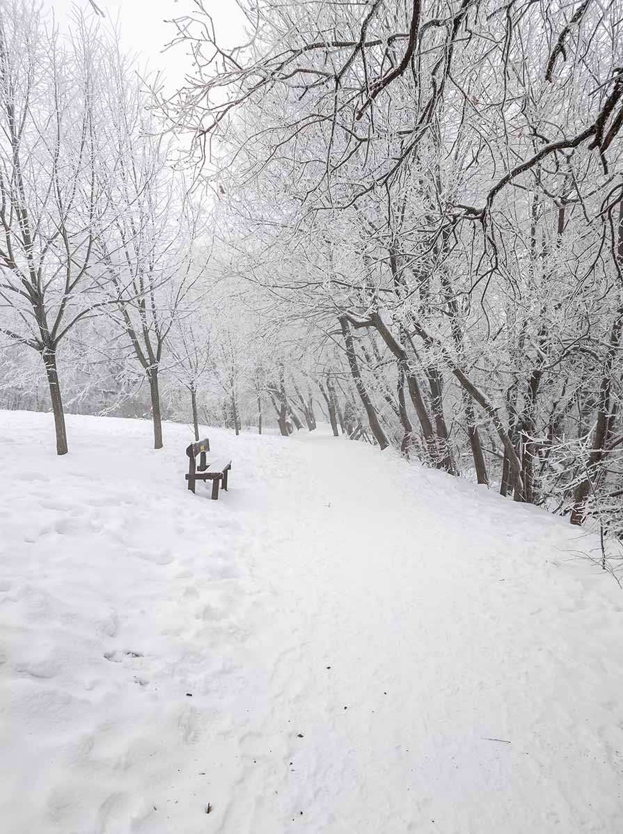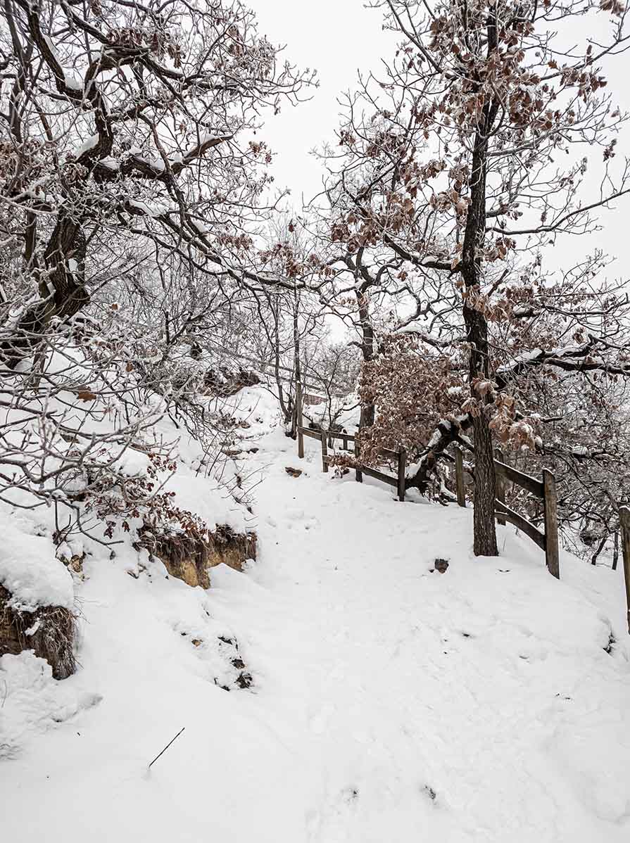 📍 Az útvonal az Anna-réttől ereszkedve éri el a vadregényes kőtömböket: a Tündér-szikla fehéren csillogó dolomittömbje a téli tájban különösen misztikus látványt nyújt. 🏙️ Itt a széles sétányokat felváltja a keskenyebb erdei csapás, amely szorosan a sziklafalak tövében és fák gyökerei között kanyarog. ⚠️ A csúszós, lefagyott szakaszok és a meredekebb lejtők miatt fokozott óvatosság szükséges, a korlátok csak részben védenek, így a stabil lépés elengedhetetlen a havas rengetegben.