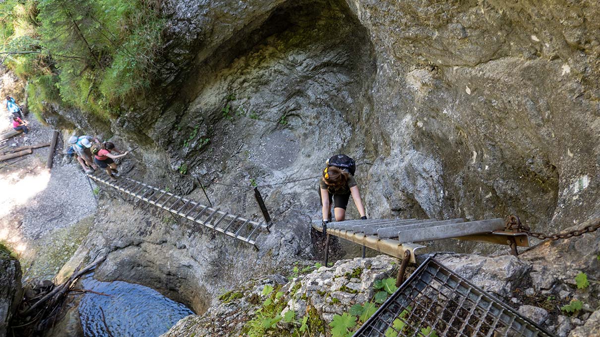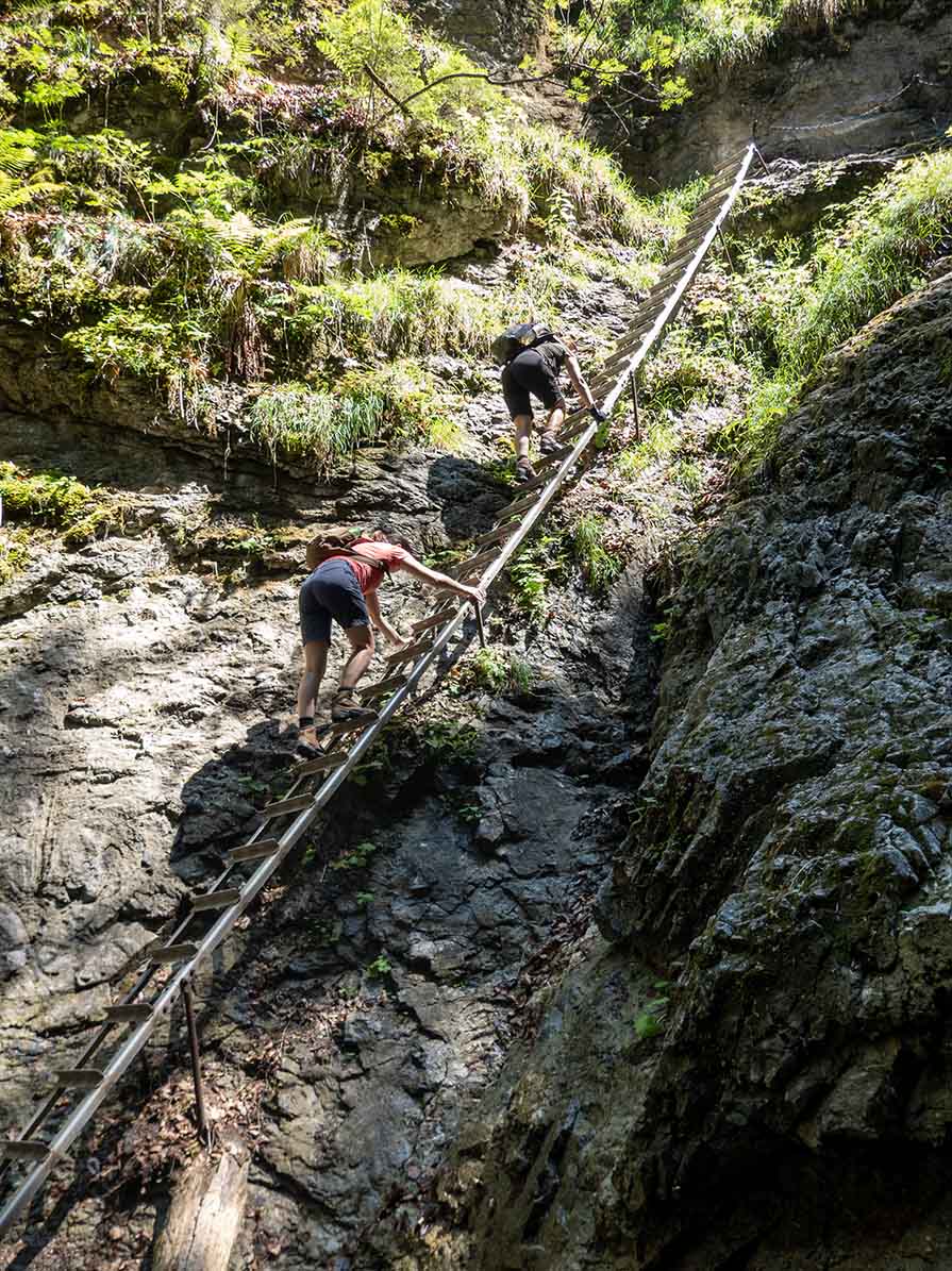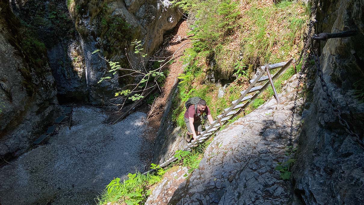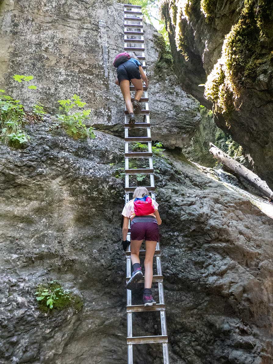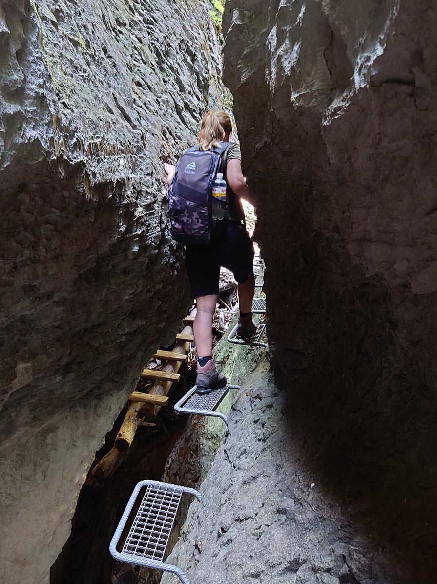 🥾 A Suchá Belá a Szlovák Paradicsom legismertebb szurdoka, ahol a túra vízesések, sziklafalak és létrák között vezet végig. A Podlesok parkolóból induló ösvény eleinte erdőn és mederszakaszon halad, majd fokozatosan egyre több fém létra, lánc és palló segíti az emelkedést a meredek kanyonban 🌿⛰️.