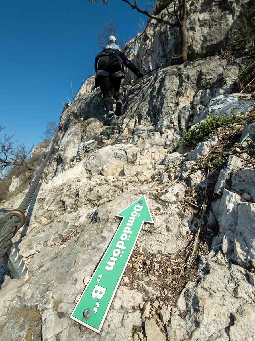 ℹ️ Tájékoztatás: a „DÖMDÖDÖM” B jelzésű pálya, amely kezdők számára is teljesíthető, de a kitettebb részek miatt biztos mozgás és teljes via ferrata felszerelés szükséges. A rövid mászás jó bevezetés a tatabányai ferraták világába. 🇭🇺