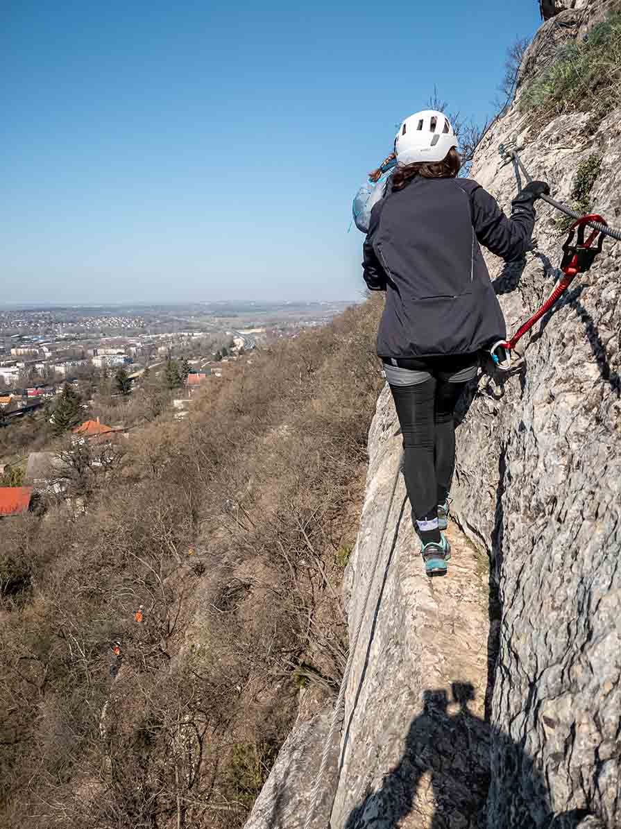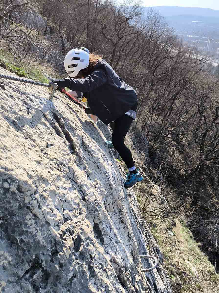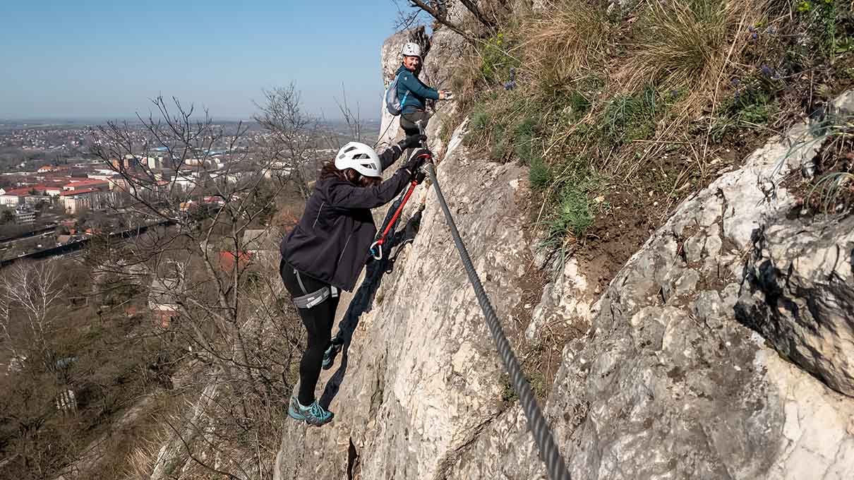 🌉 Szakaszok és mozgás: a pálya létrákkal, rövid traverzekkel és meredekebb sziklafalrészekkel tagolt. A beszállás után egy könnyebb falrész következik, ahol gyorsan magasságot nyerünk. Ezt rövid oldalazások és létrás részek váltják, amelyek jól mászható, mégis kitett szakaszokon vezetnek. A középső rész látványosabb, itt rövid függőleges lépések és kisebb áthajlások jelennek meg, miközben a Turul alatti sziklafalról egyre szélesebb panoráma nyílik a város és a Gerecse irányába. 🧗♀️