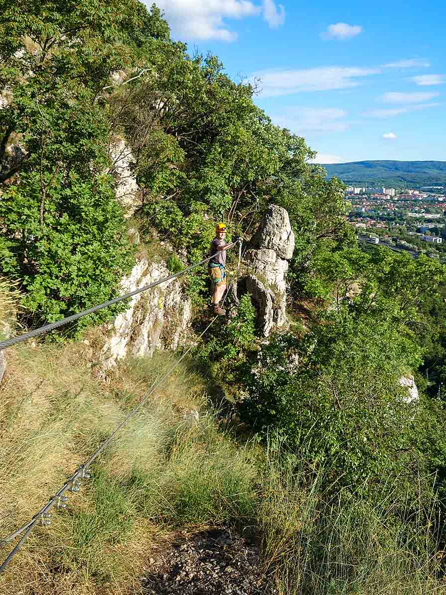 🔗 A tatabányai „Hét Vezér” via ferrata a Gerecsében, a Turul alatti Kő-hegy oldalán futó D nehézségű pálya.