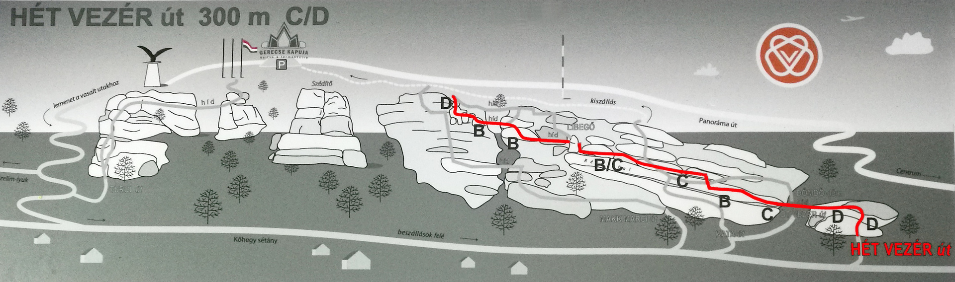 ℹ️ Tájékoztatás: a „Hét Vezér” D jelzésű pálya, amely technikás mozdulatokat, jó karerőt és biztos lábmunkát igényel. A rövid, de intenzív szakaszok miatt a megfelelő via ferrata felszerelés és a ferrata tapasztalat erősen ajánlott. 🇭🇺