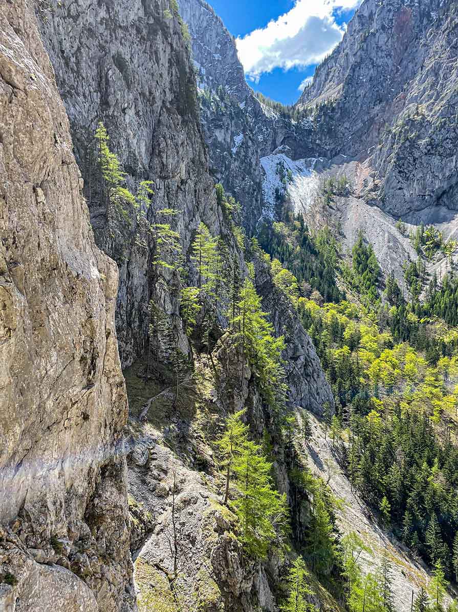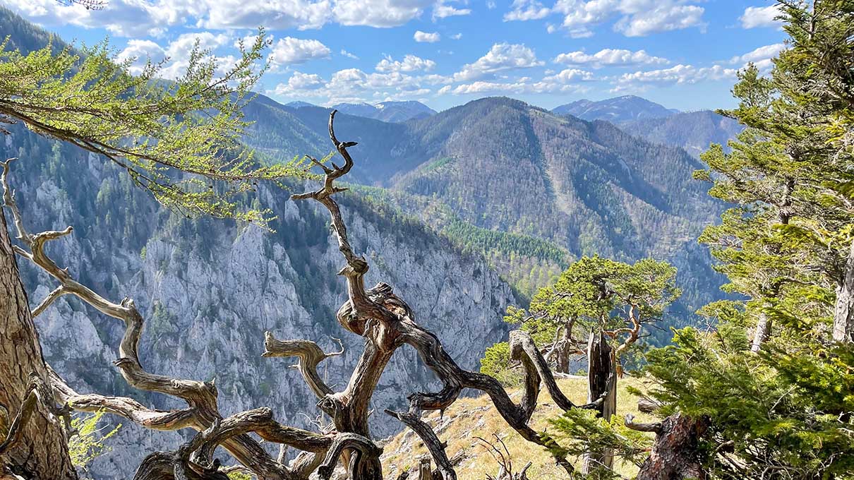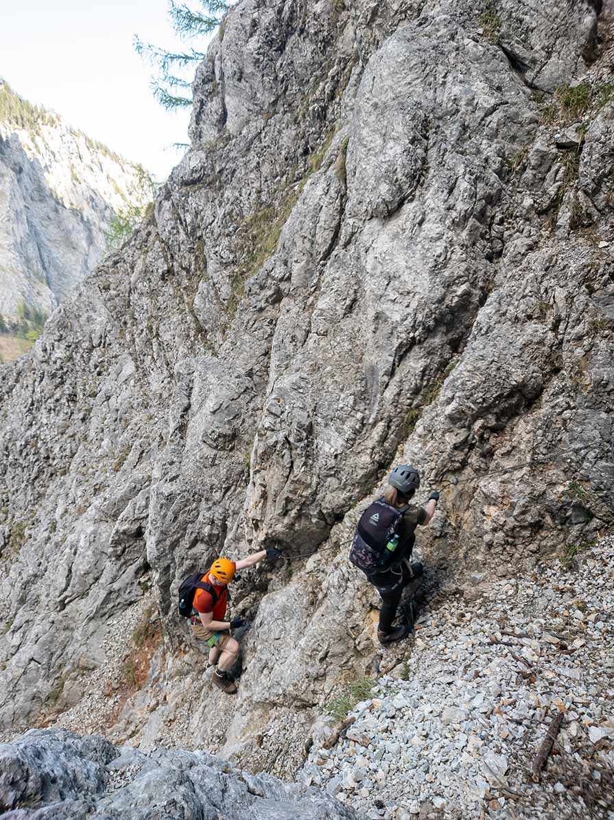 🧗 A Teufelsbadstubensteig klasszikus raxalpei klettersteig a Höllental fölött; létrákon, traverzeken és egy rövid kéményen haladunk a sziklafalban, végig kilátással a Schneebergre. A kiszálló a Wachthüttelkamm peremére ér, onnan erdei úton térünk vissza. 🇦🇹