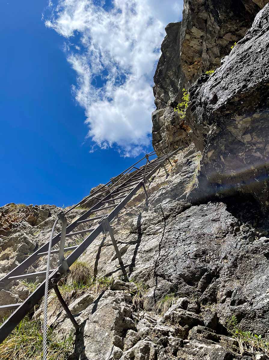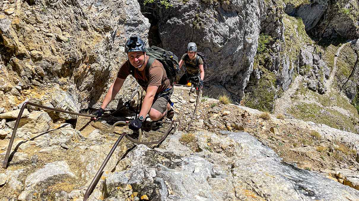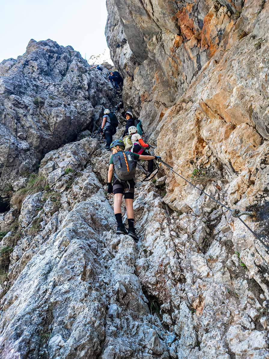 A vasalt út változatos: biztosított kémények, párkánytraverzek, sziklabevágások és rövid, kötél nélküli átmenetek váltják egymást. A középső szakaszon szűk, barlangszerű átjárók fordulnak elő, helyenként mély vályús, törmelékes bevágásokkal. A felső rész nyitottabb, szélesebb párkányokkal és egyenletesebben jelölt lépésközökkel ⛰️.