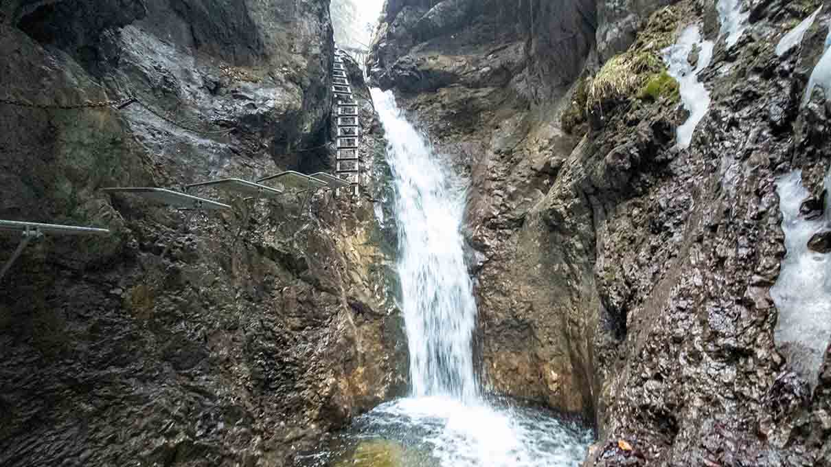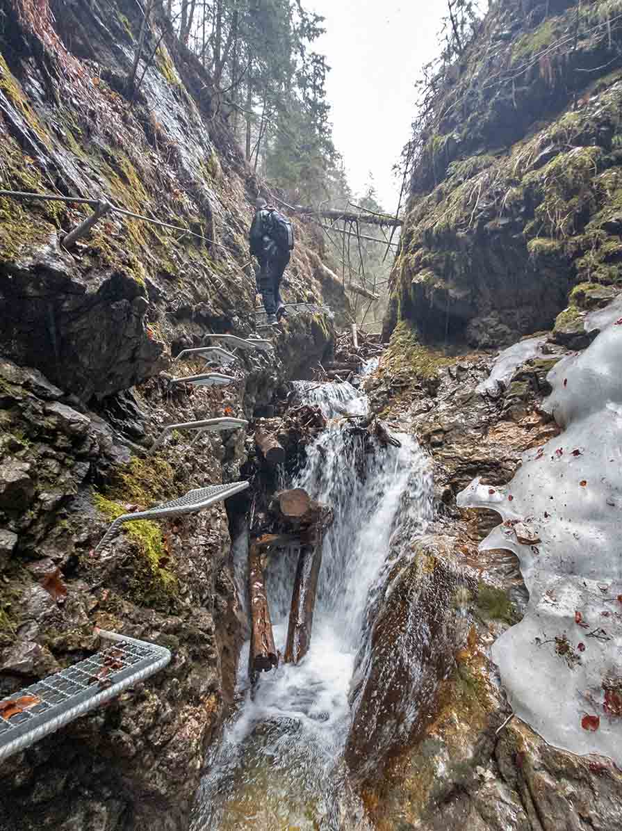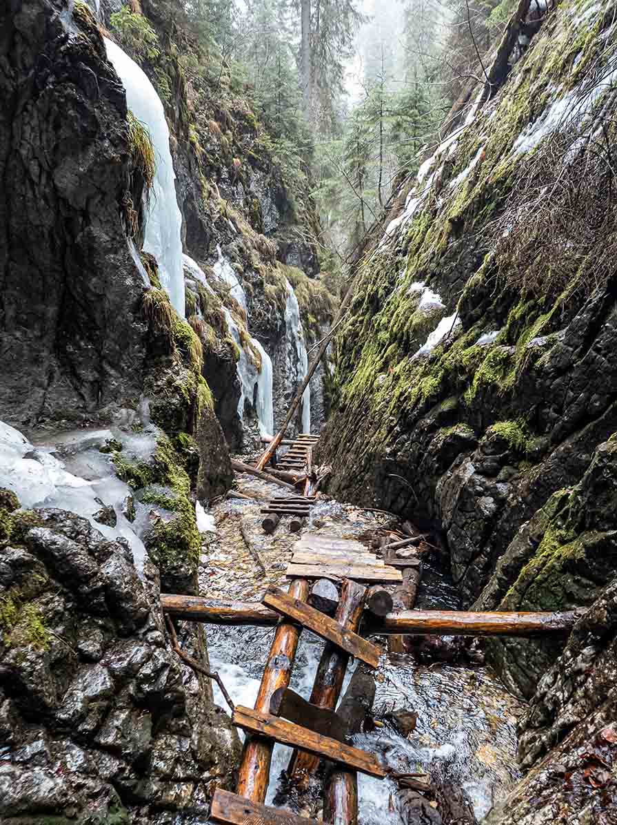 🌊 A szurdok alsó részén található a Malý vodopád, egy 8,5 méter magas vízesés, amely mellett fém létra segíti az áthaladást. Nem sokkal feljebb következik a Veľký vodopád, amely 7 méter magas, és a kanyon egyik leglátványosabb pontja. A víz közvetlenül a sziklafalról zuhan a patakmederbe. 💧