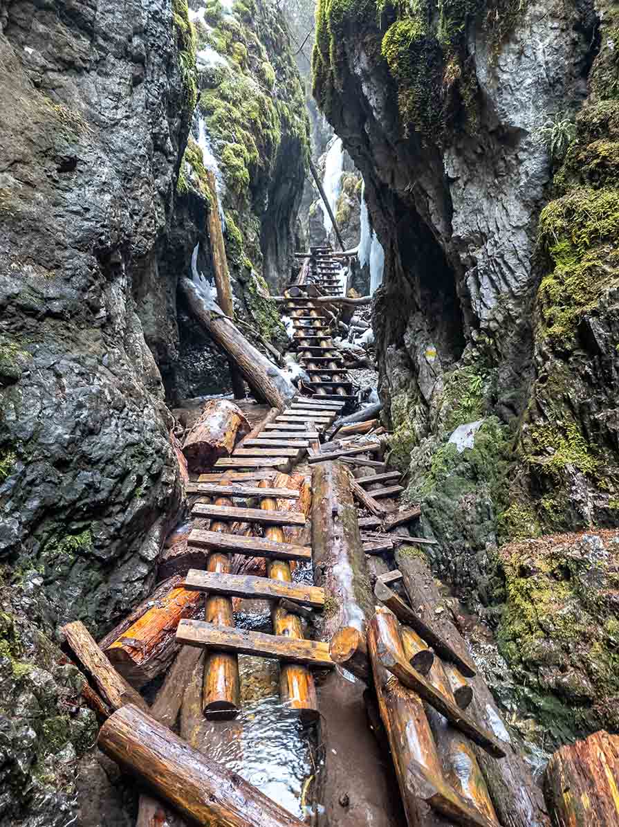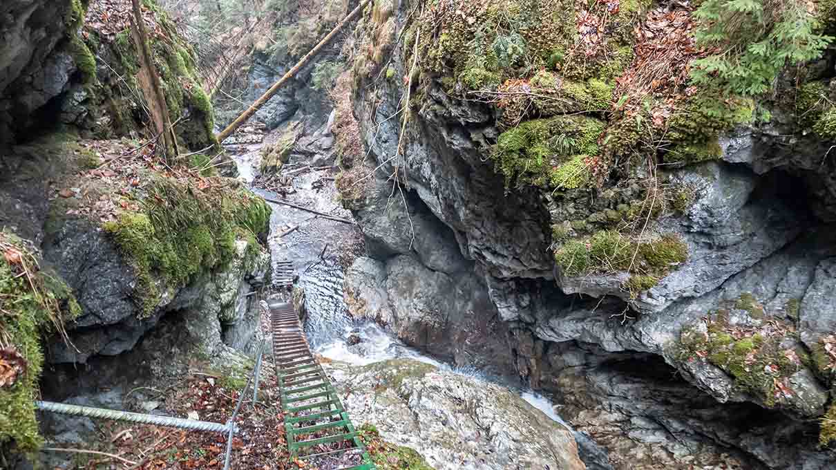 🪜 A vízesések után a szurdok még szűkebb sziklafolyosóvá válik. Fa hidak, rövidebb létrák és kőlépések segítik az áthaladást, miközben a meredek falak között egyre mélyebbre haladunk. A hosszú kanyonban közel 5–6 kilométeren keresztül követjük a patak völgyét. 🧗♂️